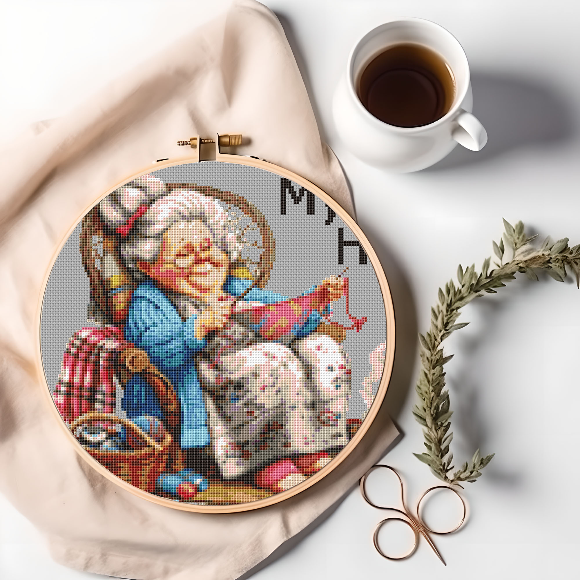 Make a Whimsly cross stitch of Grandma in her happy place as a gift for that special friend or for yourself!